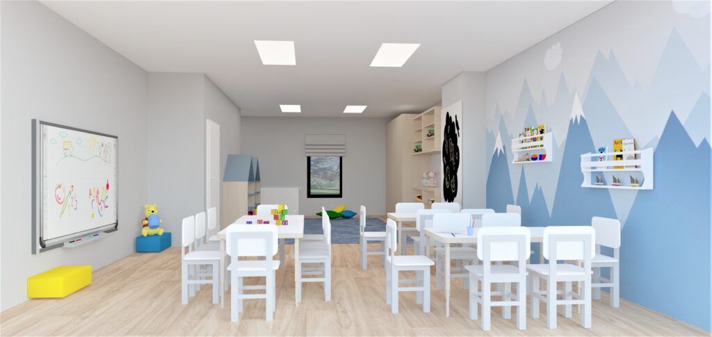 W budynku znajdują się 3 komfortowe sale przedszkolne, każda o powierzchni około 55 m2, zaprojektowane tak, aby swobodnie mogły się w nich bawić i uczyć dzieci z podziałem na różne grupy wiekowe.